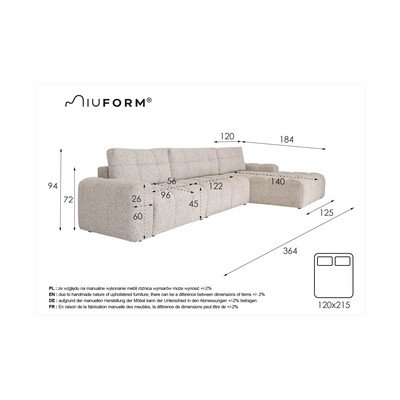 Kinyitható-tárolóhelyesJobb oldaliKrémszínűÖt- és többszemélyesSzélesség 364 cmMélység 184 cmÜlésmélység 56 cm