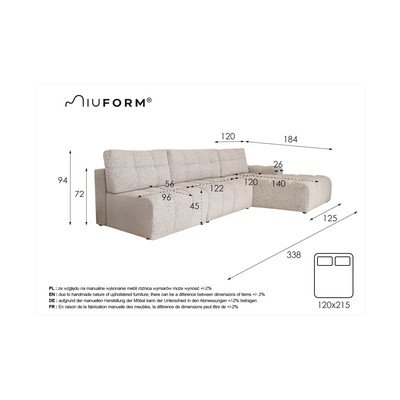 Kinyitható-tárolóhelyesJobb oldaliKrémszínűHáromszemélyesSzélesség 338 cmMélység 184 cmÜlésmélység 56 cm
