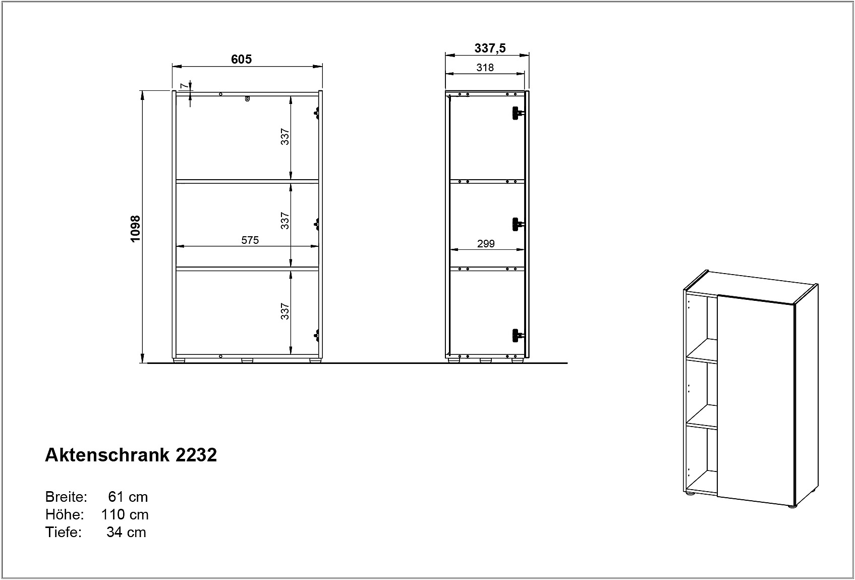 Az Adrano könyvespolc egy ajtóval rendelkezik, ami mögött két rögzített polc található. Ezek három részre osztják a teret. Az ajtó csak a könyvespolc 2/3-át fedi, így három nyitott rekesz jön létre. A felső polc teherbírása max. 10 kg, az alsó polcé pedig max. 25 kg. A könyvespolchoz öt fekete műanyag csúszka is jár.
