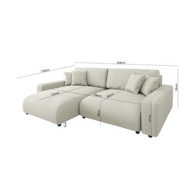 Sara sarokkanapéKordbársony, kinyitható-tárolóhelyes, jobb oldali-bal oldali-variálható sarok-heverő résszel, krémszínű, háromszemélyes, szélesség 234 cm
