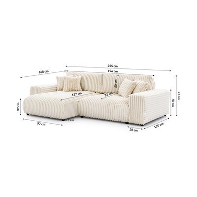 Kordbársony, kinyitható-tárolóhelyes, bal oldali, krémszínű, vízlepergető-foltálló, háromszemélyes, szélesség 255 cm