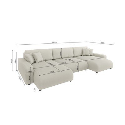 Kordbársony, kinyitható-tárolóhelyes, U alakú, krémszínű, öt- és többszemélyes, szélesség 332 cm