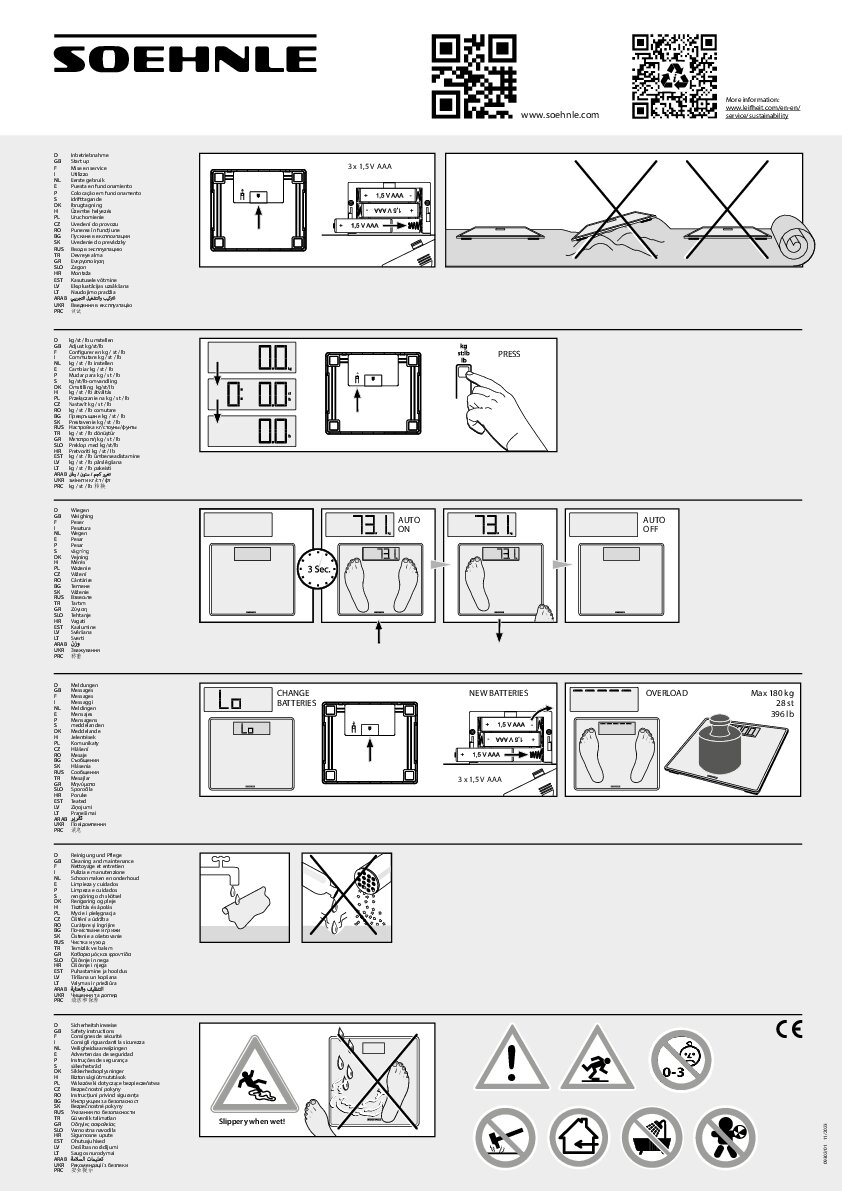 A Soehnle Sense Safe 300 mérleg egy ultravékony digitális mérleg, extra nagy, jelöletlen rozsdamentes acél lábtérrel. Nagyméretű LCD kijelzővel rendelkezik, 4,5 cm-es számjegyekkel. Maximális terhelhetősége 180 kg, mérési pontossága pedig 100 g. A mérleg automatikusan bekapcsol, és kikapcsol használat után. Három AAA elemmel működik, amelyeket a csomag tartalmaz.