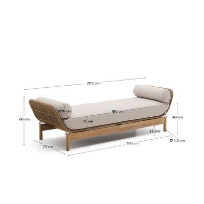 A kanapé UV-álló, így tökéletesen alkalmas a kertbe, a teraszra vagy a medence mellé. A kényelmes párnák levehető huzattal rendelkeznek, így könnyen tisztán tarthatók. A végein lévő hengeres támasztékoknak köszönhetően kényelmes pihenőhelyet biztosít.