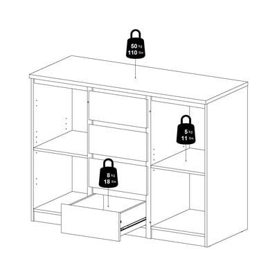 Középen négy fiók, az oldalakon pedig két, állítható polcos, ajtós rész található.