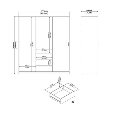 Két tolóajtóval, egy klasszikus ajtóval, három fiókkal, valamint polcok és rudak kombinációjával rendelkezik. A tölgyfa dekor és a természetes szín elegáns megjelenése jól illik a modern belső terekbe.