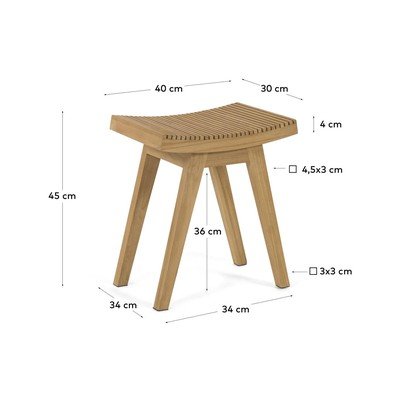 A Kave Home márka Vicentina natúr színű teakfa ülőkéje masszív teakfából készült. Ülőfelületét ívelt lécek alkotják. Nedvességállóságának köszönhetően praktikus és stílusos kiegészítő a fürdőszobában vagy más, magasabb páratartalmú helyiségekben.