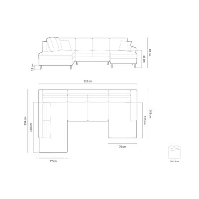 Bársony, kinyitható-tárolóhelyes, bal oldali-U alakú, petróleum színű, öt- és többszemélyes, szélesség 313 cm