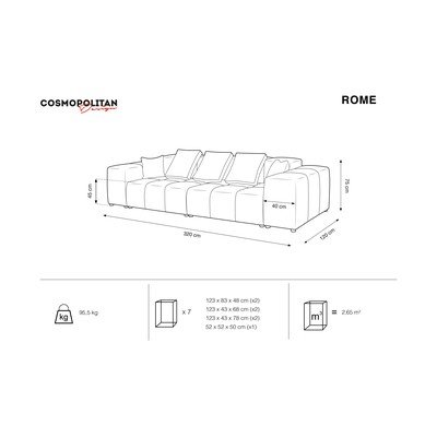 Fedezd fel a funkcionalitás és az elegancia kombinációját, és válassz egy többféle színben elérhető Rome Velvet kanapét! A kanapé négyszögletes és négyzet alakú modulból, háttámlából és karfából áll, amelyeket külön-külön is megvásárolhatsz, hogy saját igényeidnek és a belső térnek megfelelő kanapét hozhass létre. A modulokból kisebb vagy nagyobb kanapét, sarokkanapét vagy akár U alakú kanapét is összeállíthatsz. A Rome Velvet termékcsalád a párnák terén is nagy változatosságot kínál különböző méretben és színben, amelyek hangulatosabbá teszik a kanapét, valamint kényelmet nyújtanak. A kanapé szövet verzióját aRome kanapét is kipróbálhatod. Megjegyzés: Ne porszívózd a kanapét. A huzatok nem levehetők.