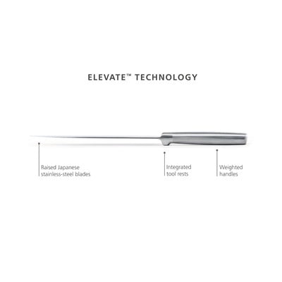 A kések ergonomikus Elevate nyelűek, beépített bukókerettel, amely megakadályozza, hogy a késpenge hozzáérjen a munkafelülethez. A kések minőségének megőrzése érdekében kézi mosást és azonnali szárítást javaslunk. A bambusz tartó nedves ruhával tisztítható.