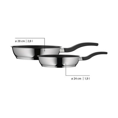 A WMF márka Devil rozsdamentes acél serpenyő készlete praktikus kiegészítő minden konyhában. Ez a szett két, különböző méretű serpenyőt tartalmaz, 24 cm és 28 cm átmérővel.