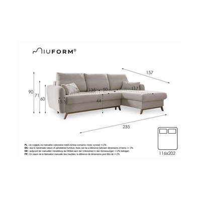 A bükkfa konstrukció és az érdekes, ferde lábak könnyed megjelenést biztosítanak. A kellemes tapintású szövet, a semleges színek és a letisztult formák időtálló kanapémodellt hoznak létre, amely egy szezon után sem megy ki a divatból.