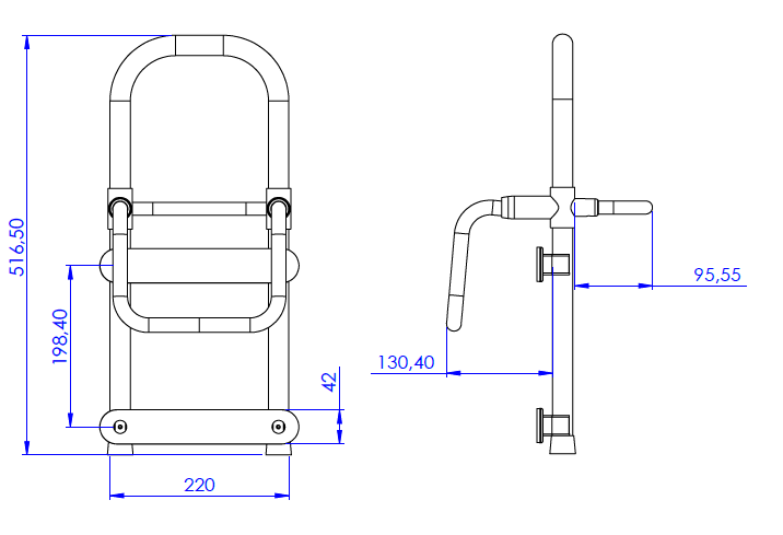 Masszív építésű, biztonságérzetet adó fürdőszobai segédeszköz.