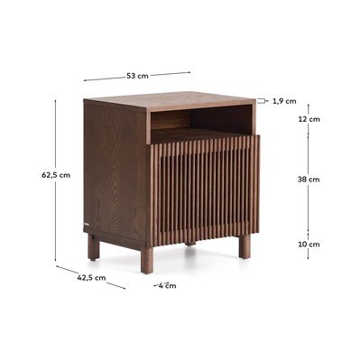 A Kave Home márka Beyla éjjeliszekrénye a kőrisfa szépségét a gondosan kidolgozott dizájnnal ötvözi. Konstrukciója kőris furnérból készült, míg az ajtók és a lábak tömörfából vannak.
