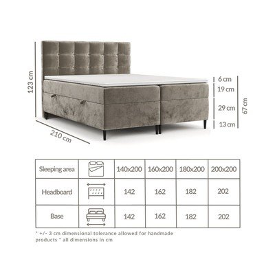 Ez a boxspring ágy egy kiváló minőségű, bonellrugókból és poliuretánhabból álló matracot és egy kétoldalas, rugalmas poliuretánhabból készült toppert kombinál. A topper nemcsak fokozott alvási kényelmet biztosít, hanem megbízhatóan védi a matracot a sérülésektől és a szennyeződésektől is. Algakivonatos huzata bármikor levehető és max. 40 ⁰C-on mosható.