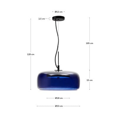 A Kave Home márka sötétkék Reig függőlámpája 38 cm átmérőjű üvegbúrával, beépített 10 W-os LED fénnyel rendelkezik. Az azonos kollekció többi darabjával jól kombinálható.