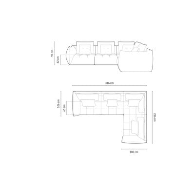 Bársony, jobb oldali-L alakú, háziállatbarát-foltálló, szürke, öt- és többszemélyes, szélesség 316 cm