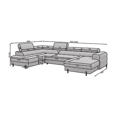 Buklé, állítható-kinyitható, bal oldali-U alakú, sötétszürke, öt- és többszemélyes, szélesség 358 cm