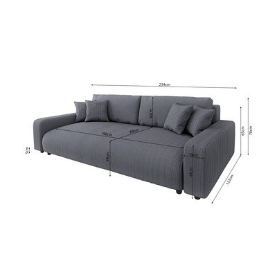 Kordbársony, kinyitható-tárolóhelyes, sötétszürke, háromszemélyes, szélesség 234 cm