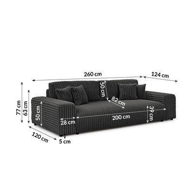 Kordbársony, kinyitható-tárolóhelyes, sötétszürke, vízlepergető-foltálló, háromszemélyes, szélesség 260 cm