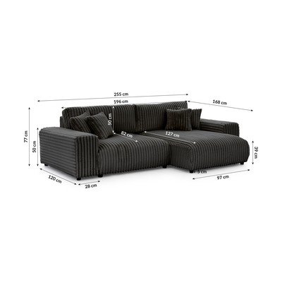 Kordbársony, kinyitható-tárolóhelyes, jobb oldali, sötétszürke, vízlepergető-foltálló, háromszemélyes, szélesség 255 cm