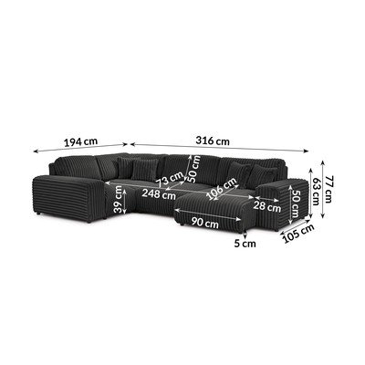 Kordbársony, bal oldali-U alakú, sötétszürke, vízlepergető-foltálló, négyszemélyes, szélesség 316 cm