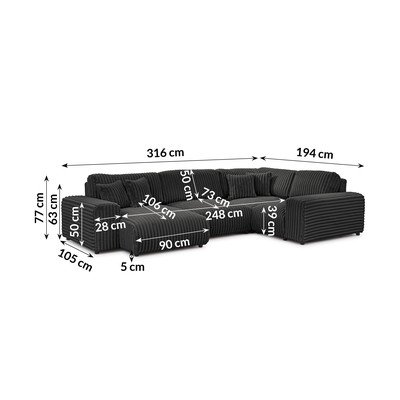 Kordbársony, jobb oldali-U alakú, sötétszürke, vízlepergető-foltálló, négyszemélyes, szélesség 316 cm