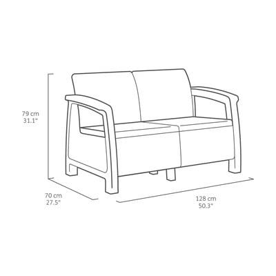 A Corfu kerti bútorszett egy kétszemélyes kanapéból, 2 kényelmes ülőfelülettel ellátott fotelből és egy rattanszerű, műszálas szerkezetű asztalból áll.