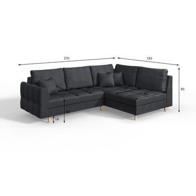 Jobb oldali-L alakú, sötétszürke, háromszemélyes, szélesség 231 cm
