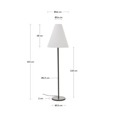 A Kave Home márka Navat állólámpája elegáns, mégis minimalista stílust visz a belső térbe. Sötétzöld kivitelű fémből készült, és fehér szövetből készült kúp alakú búra egészíti ki. E27-es izzóval kompatibilis, amelynek maximális teljesítménye 40 W. Az izzó nem tartozék.