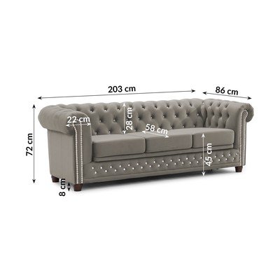 Bársony, kinyitható, chesterfield, szürke, vízlepergető-foltálló, kétszemélyes, szélesség 203 cm