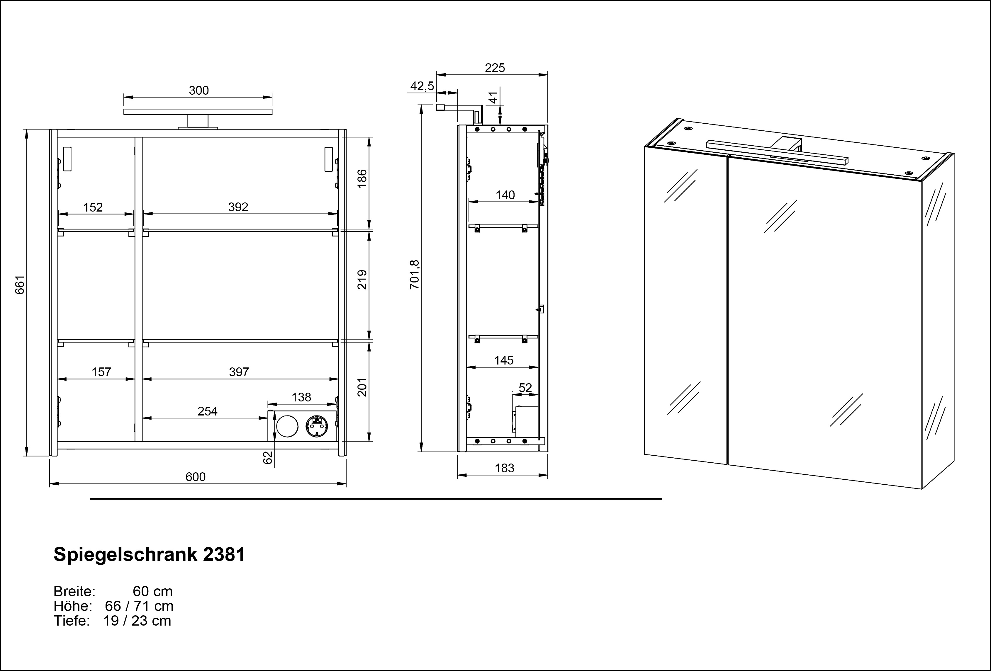 Fali-tükrös-világítással, forgácslap, felületkezelés: melamin, szürke, szélesség 60 cm, magasság 71 cm, mélység 23 cm