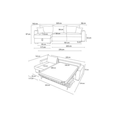 Kordbársony, mindennapos alvásra-kinyitható-tárolóhelyes, jobb oldali-bal oldali-variálható sarok-heverő résszel, szürke, öt- és többszemélyes, szélesség 320 cm