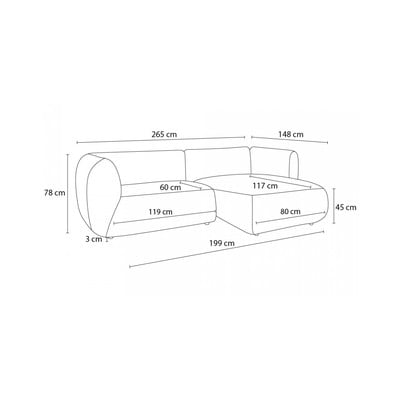 Kordbársony, bal oldali, szürke, háromszemélyes, szélesség 265 cm, mélység 148 cm