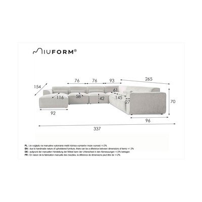 Jobb oldali-U alakúSötétszürkeÖt- és többszemélyesSzélesség 337 cmMélység 265 cmÜlésmélység 58 cm