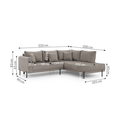Zsenília, jobb oldali-L alakú, szürkésbarna, háziállatbarát-foltálló, négyszemélyes, szélesség 233 cm