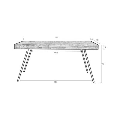 A White Label étkezőasztal matt fekete színű, újrahasznosított teakfa asztallappal rendelkezik, átlátszó lakkozással.