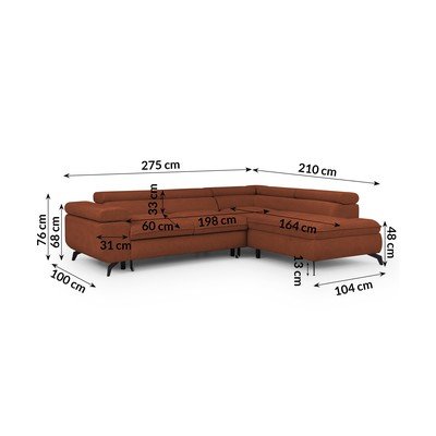 Marbeya sarokkanapéZsenília, állítható-kinyitható-tárolóhelyes, jobb oldali-L alakú, terrakotta színű, háziállatbarát-foltálló, négyszemélyes, szélesség 275 cm