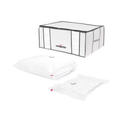 A felesleges levegőt kényelmesen kiszívhatod az otthoni porszívóval. Az egyirányú szelepnek köszönhetően nem kell aggódnod amiatt, hogy a levegő kiszívása után a zsák újra felfújódik. Az átlátszó ablakoknak köszönhetően a tartalom könnyen azonosítható. Pántja miatt akár függőleges helyzetben is elhelyezhető.