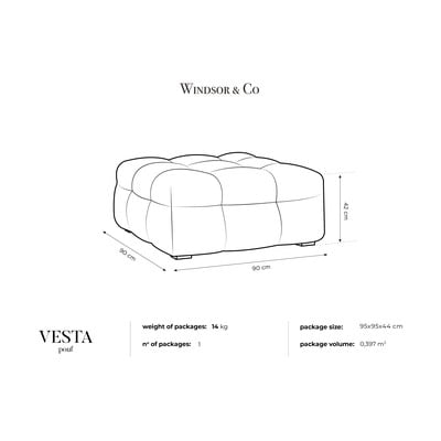 Ezt a Vesta puffot számos színben kínáljuk. A klasszikus stílus mellett a finom textúra is magával ragad. A védőfelületnek köszönhetően a folyadék nem szivárog be az anyagba. Ráadásul az elegáns megjelenést könnyedén összeillesztheted a legtöbb enteriőrrel. A Windsor & Co Sofas modern klasszikusához ez a kanapé illik a legjobban.
