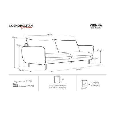 A kanapé a szokásosnál magasabb lábakon áll, ami megkönnyíti a porszívózást és a padló tisztítását.