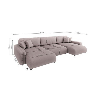Kordbársony, kinyitható-tárolóhelyes, U alakú, világos rózsaszín, öt- és többszemélyes, szélesség 332 cm
