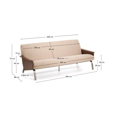 A kanapé szerkezete tartós, 18 mm-es rétegelt lemezt ötvöz tiszta vonalú, tölgyfa furnérral borított karfákkal. Az 1,8 mm átmérőjű, szálcsiszolt rozsdamentes acél lábak modern és stabil megjelenést adnak az egész dizájnnak. Az ülőfelület közepes keménységet kínál, ami mindennapi használatra ideális. Ez a pántok, rugók és nagy sűrűségű habrétegek (35kg/m³ és 40kg/m³) átgondolt kombinációjának köszönhető, amelyek szilárdságot, tartósságot és kiváló kényelmet biztosítanak.