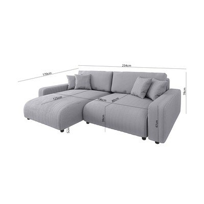Sara sarokkanapéKordbársony, kinyitható-tárolóhelyes, jobb oldali-bal oldali-variálható sarok-heverő résszel, világosszürke, háromszemélyes, szélesség 234 cm
