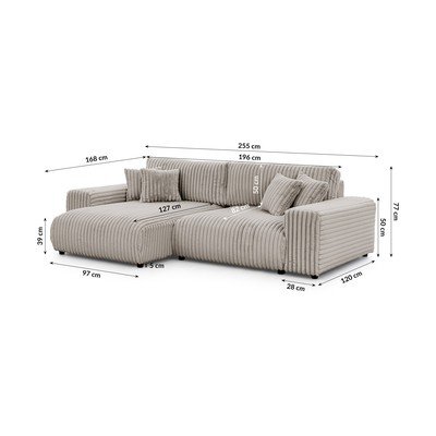 Kordbársony, kinyitható-tárolóhelyes, bal oldali, világosszürke, vízlepergető-foltálló, háromszemélyes, szélesség 255 cm