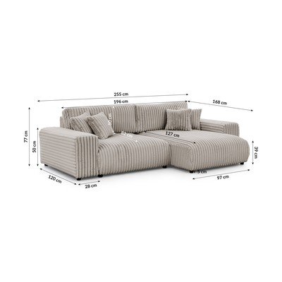 Kordbársony, kinyitható-tárolóhelyes, jobb oldali, világosszürke, vízlepergető-foltálló, háromszemélyes, szélesség 255 cm
