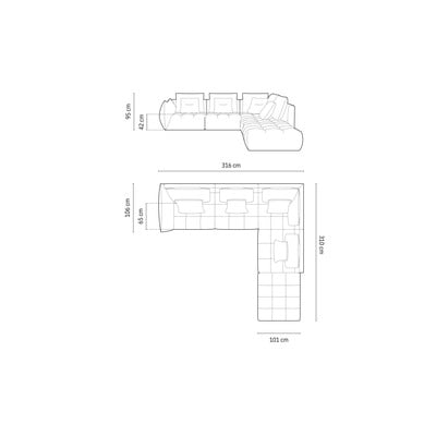 Jobb oldali-L alakú, szürke, öt- és többszemélyes, szélesség 316 cm