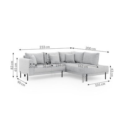 Zsenília, jobb oldali-L alakú, világosszürke, háziállatbarát-foltálló, négyszemélyes, szélesség 233 cm