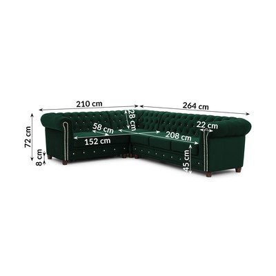 Bársony, kinyitható, chesterfield, bal oldali-L alakú, zöld, vízlepergető-foltálló, négyszemélyes, szélesség 264 cm