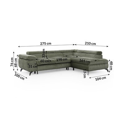 Kordbársony, állítható-kinyitható-tárolóhelyes, jobb oldali-L alakú, zöld, háziállatbarát-foltálló, négyszemélyes, szélesség 275 cm